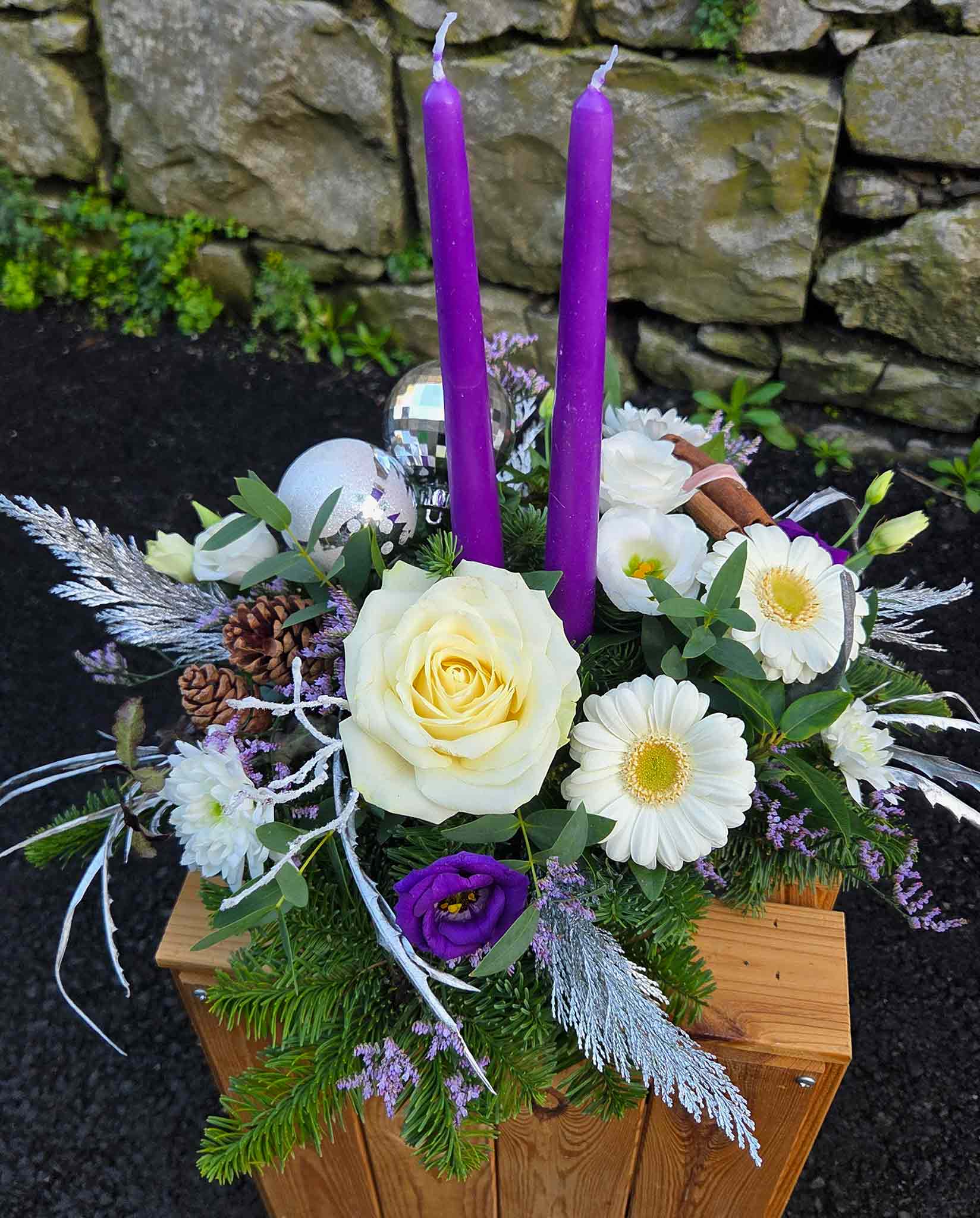 The perfect alternative to red this Christmas. Candles in the arrangement will be either purple, silver or white.